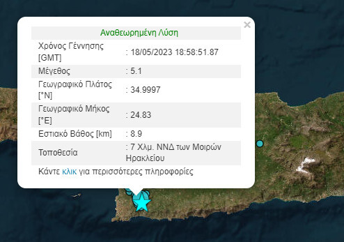«Δυνατός σεισμός στη νότια Κρήτη μεγέθους 5,1 στις 21.58. Επίκεντρο σε χερσαίο χώρο 10 χλμ νοτιοδυτικά των Μοιρών.