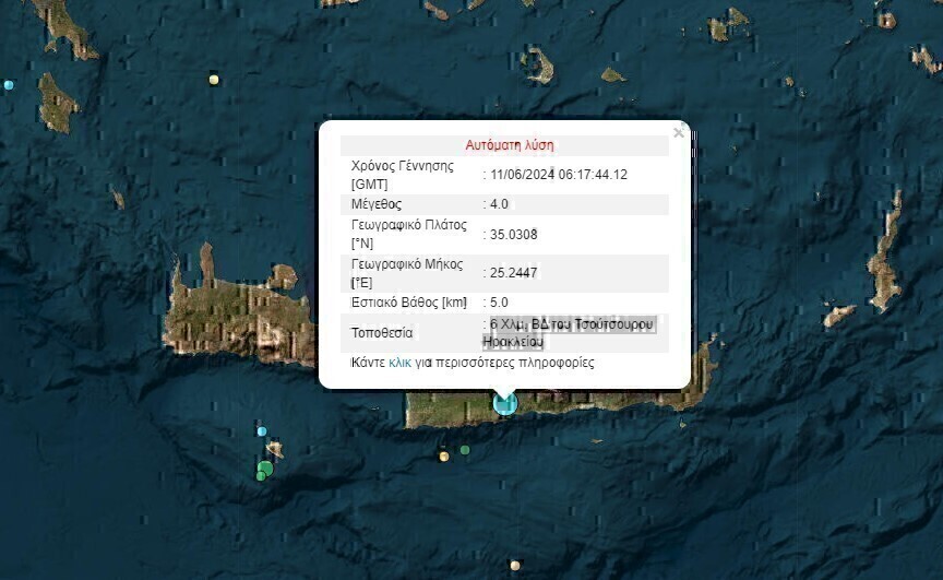 Σύμφωνα με το Γεωδυναμικό Ινστιτούτο, ο σεισμός ήταν μεγέθους 4 βαθμών της κλίμακας Ρίχτερ και το επίκεντρό του εντοπίζεται 6 Χλμ. Βορειοδυτικά του Τσούτσουρου Ηρακλείου.