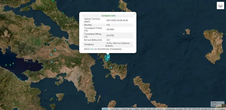 Σύμφωνα με το Γεωδυναμικό Ινστιτούτο Αθηνών, ο σεισμός ήταν μεγέθους 5 βαθμών της κλίμακας Ρίχτερ, με επίκεντρο τη Νότια Εύβοια, στο ίδιο σημείο που καταγράφηκε και ο πρωινός σεισμός, 8 χιλιόμετρα νοτιοανατολικά των Ζαράκων. Λίγα λεπτά αργότερα, το Γεωδυναμικό διόρθωσε το μέγεθος σε 4,9 Ρίχτερ, και στη συνέχεια επανήλθε στα 5 Ρίχτερ, ενώ το εστιακό βάθος εκτιμήθηκε στα 8,9 χιλιόμετρα.
