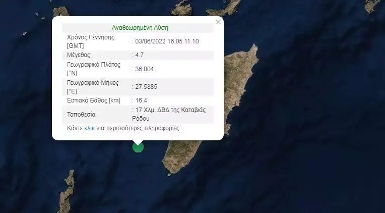 Σύμφωνα με την Αυτόματη Λύση του Γεωδυναμικού Ινστιτούτου ο σεισμός σημειώθηκε στις 19:05 και ήταν μεγέθους 4,7 βαθμών της κλίμακας Ρίχτερ . Το επίκεντρο του σεισμού ήταν 4 χιλιόμετρα δυτικά, νοτιοδυτικά της Καταβιάς Ρόδου και είχε εστιακό βάθος 10 χιλιόμετρα.