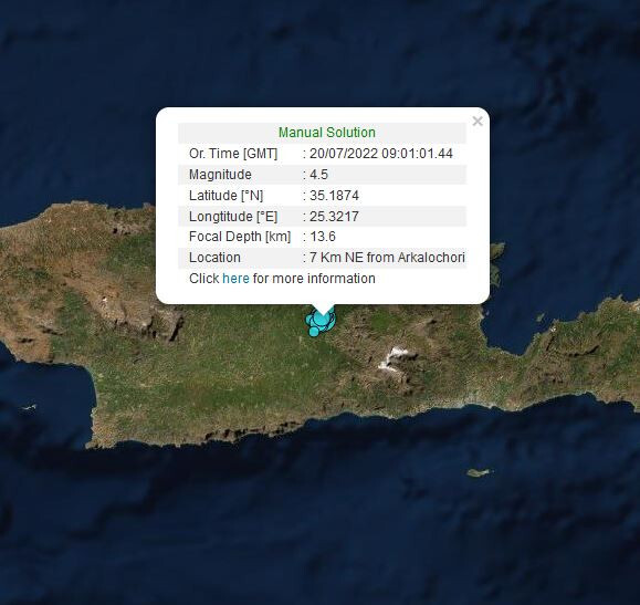 Το επίκεντρό της εντοπίζεται στα οκτώ χιλιόμετρα νότια νοτιοανατολικά του Αρκαλοχωρίου. Το εστιακό βάθος υπολογίζεται σε 5 χιλιόμετρα.