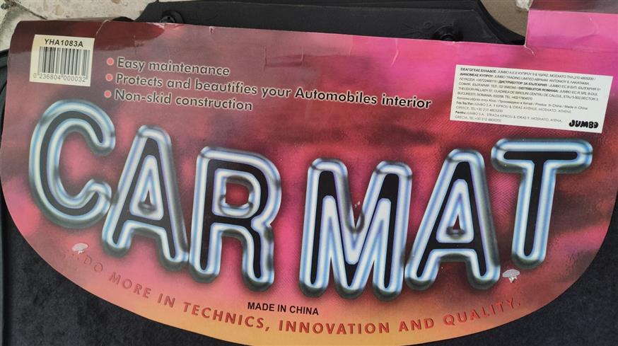 Η ανάκληση αφορά μαύρα πατάκια αυτοκινήτου, τα οποία διατίθενται με τον γραμμωτό κώδικα (barcode) 0236804000032 και φέρουν την εμπορική επωνυμία Jumbo. Το προϊόν είναι κινεζικής προέλευσης και διατίθεται σε απλή συσκευασία με χάρτινη ετικέτα, χωρίς περαιτέρω πληροφορίες για τον κατασκευαστή.