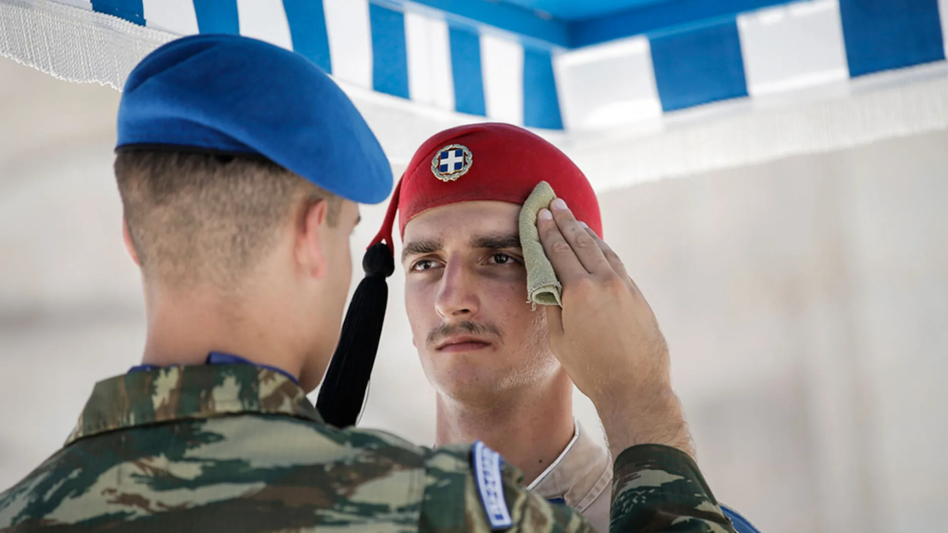 Σε φωτογραφίες που είδαν το φως της δημοσιότητας, ο αξιωματικός υπηρεσίας της Προεδρικής Φρουράς φαίνεται να τους προσφέρει παγωμένο νερό, σκουπίζοντας τον ιδρώτα από τα πρόσωπά τους.