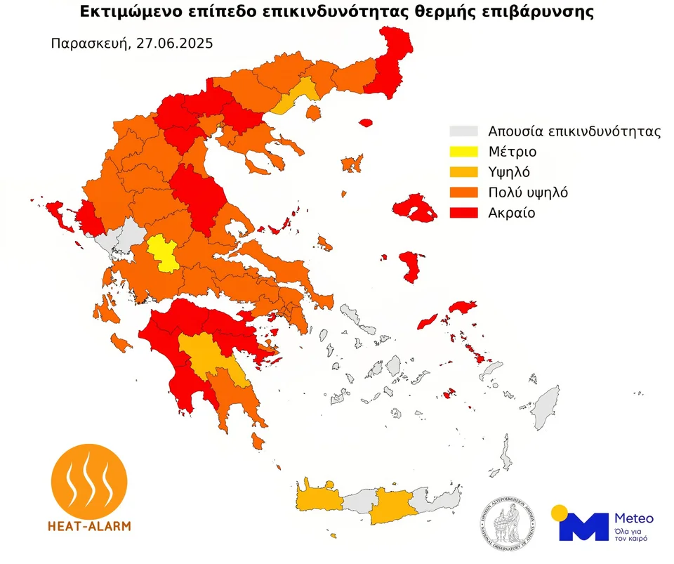 Την Παρασκευή (27/06) ακραία θερμική επιβάρυνση αναμένεται σε περιοχές της Μακεδονίας, Θράκης, Θεσσαλίας, Ηπείρου, Πελοποννήσου και νησιών Ανατολικού Αιγαίου, ενώ πολύ υψηλή θερμική επιβάρυνση αναμένεται στο μεγαλύτερο μέρος της χώρας.