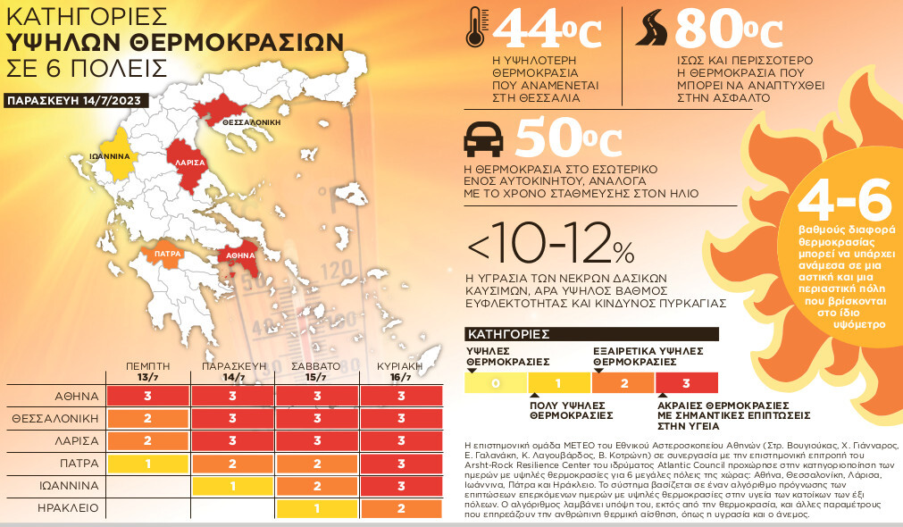 Αιτία, το φαινόμενο της αστικής θερμικής νησίδας, που εγκλωβίζει τις θερμές αέριες μάζες στη διάρκεια της ημέρας και τις «επιστρέφει» τη νύχτα. Μπορεί λοιπόν οι μετρήσεις να δείχνουν μέχρι και 43άρια, όμως η ανάσα του καύσωνα θα είναι ακόμα πιο καυτή για τις μεγαλουπόλεις. Η θερμοκρασία στην άσφαλτο μπορεί να φτάσει ακόμα και τους 80 βαθμούς Κελσίου, ενώ στο εσωτερικό των αυτοκινήτων αναπτύσσονται θερμοκρασίες που ξεπερνούν τους 50 βαθμούς ανάλογα με το χρόνο που παραμένουν σταθμευμένα στον ήλιο.