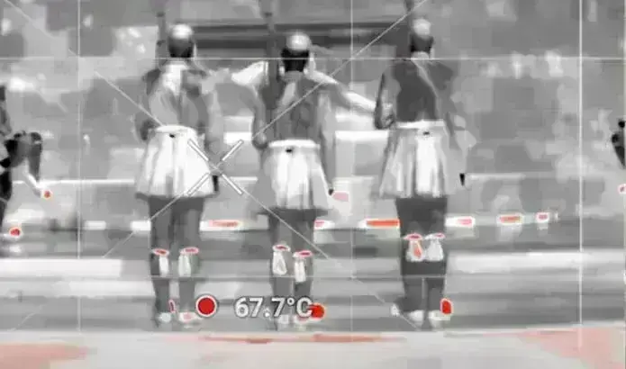 «Είναι 15:30 το μεσημέρι και πετυχαίνουμε την αλλαγή φρουράς. Η θερμοκρασία στο “φλεγόμενο” οδόστρωμα αγγίζει τους 60 βαθμούς, μέσα στο κουβούκλιο επικρατούν οι ίδιες θερμοκρασίες, ενώ οι φούντες από τα τσαρούχια των Ευζώνων αγγίζουν την θερμοκρασία των 67-70 βαθμών Κελσίου. Όλα αυτά συμβαίνουν σε μία ημέρα που δεν έχει καύσωνα» αναφέρεται στο εν λόγω βίντεο του Up Stories.
