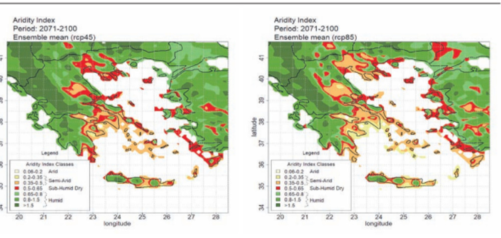 ΕΤΣΙ, ΓΙΑ το μεν μετριοπαθές σενάριο (RCP4.5), ημίξηρες κλιματικά συνθήκες προβλέπεται να επικρατήσουν στα εσωτερικά τμήματα της Θεσσαλικής και της Μακεδονικής πεδιάδας, στα πεδινά τμήματα της ανατολικής Στερεάς Ελλάδας και της Πελοποννήσου καθώς και στις Κυκλάδες και την ανατολική Κρήτη, ενώ για το απαισιόδοξο σενάριο (RCP8.5), ημίξηρες κλιματικά συνθήκες προβλέπεται να επικρατήσουν στο σύνολο της Θεσσαλικής και της Μακεδονικής πεδιάδας, στα πεδινά τμήματα της ανατολικής Στερεάς και της Πελοποννήσου, στις Κυκλάδες, στα Δωδεκάνησα και στην Κρήτη, με εξαίρεση τον νομό Χανίων και τα ορεινά τμήματα του υπόλοιπου νησιού.
