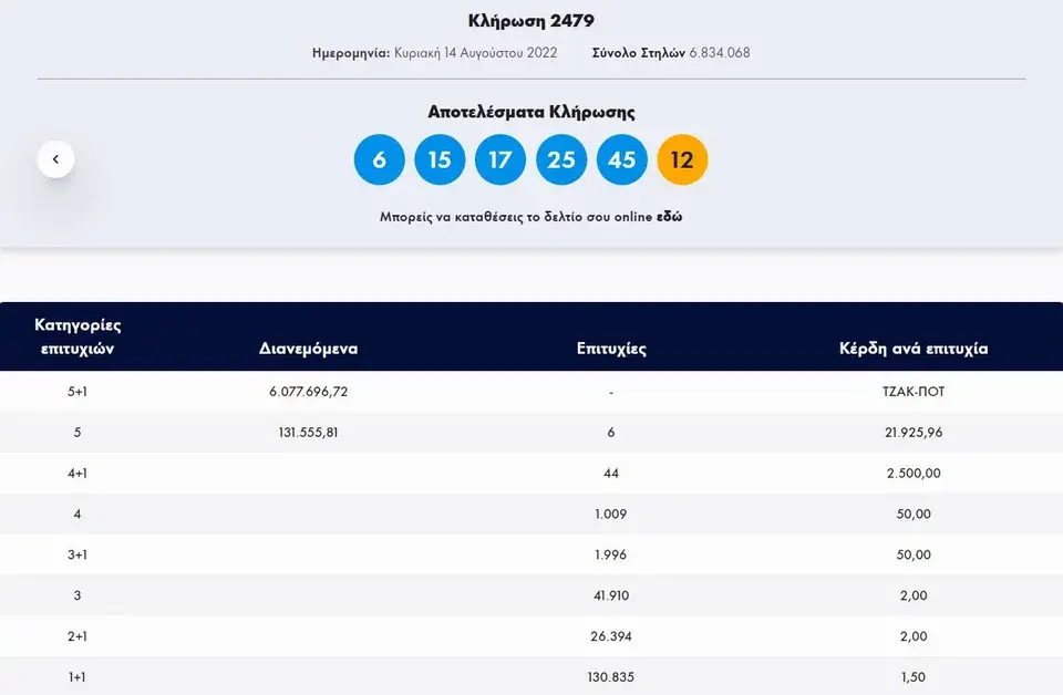 Οι τυχεροί αριθμοί του Τζόκερ είναι: 6, 15, 17, 25, 45 και τζόκερ το 12.