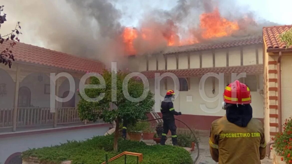 Όπως φαίνεται και από εικόνες που δημοσίευσε η «Πελοπόννησος», η καταστροφική πυρκαγιά καίει τη σκεπή του γυναικείου μοναστηριού με τους πυροσβέστες, τις μοναχές και εθελοντές να δίνουν τιτάνια μάχη για να σωθούν οι εγκαταστάσεις.