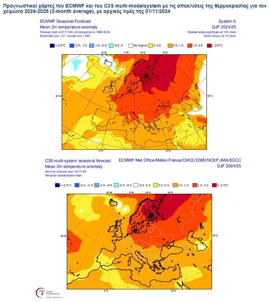Εστιάζοντας στην Ελλάδα, και τα δύο μοντέλα, ECMWF και multi-model, συμφωνούν για ένα σχετικά ήπιο χειμώνα, με τις μεγαλύτερες πιθανότητες να συμβεί αυτό, στη δυτική και νότια Ελλάδα, και τις μικρότερες στο βορειοανατολικό Αιγαίο. Συμφωνούν επίσης ότι γενικά οι μέσες θερμοκρασίες του τριμήνου Δεκέμβριος-Ιανουάριος-Φεβρουάριος, θα είναι 0,5-1 βαθμό Κελσίου πάνω από τις κανονικές, ενώ το ECMWF δεν αποκλείει στην κεντρική και ανατολική Μακεδονία, οι θετικές αποκλίσεις να ξεπεράσουν και τον 1 βαθμό Κελσίου.