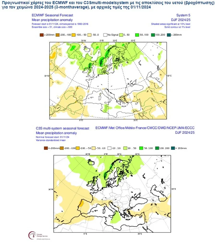 Ειδικά για την Ελλάδα, ενώ το multi-model εκτιμά ότι ο υετός δεν θα αποκλίνει σημαντικά από τις μέσες για την εποχή τιμές, με βάση το ECMWF, υπάρχουν ενδείξεις για μειωμένο υετό (βροχή-χιόνι) στο βόρειο και ανατολικό Αιγαίο και στις ηπειρωτικές περιοχές που γειτνιάζουν με αυτό, όπως η Θεσσαλία, η Εύβοια, η Χαλκιδική, η Θράκη.