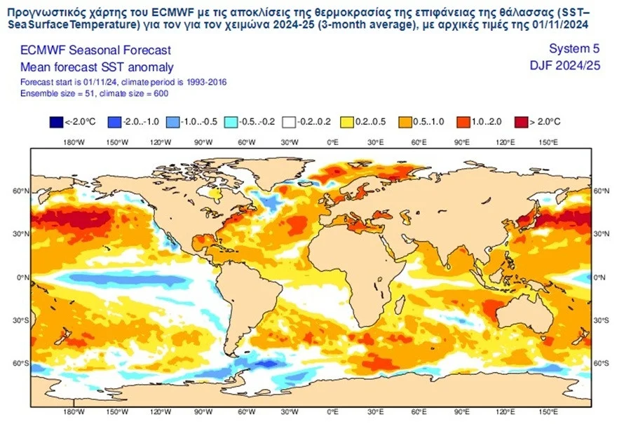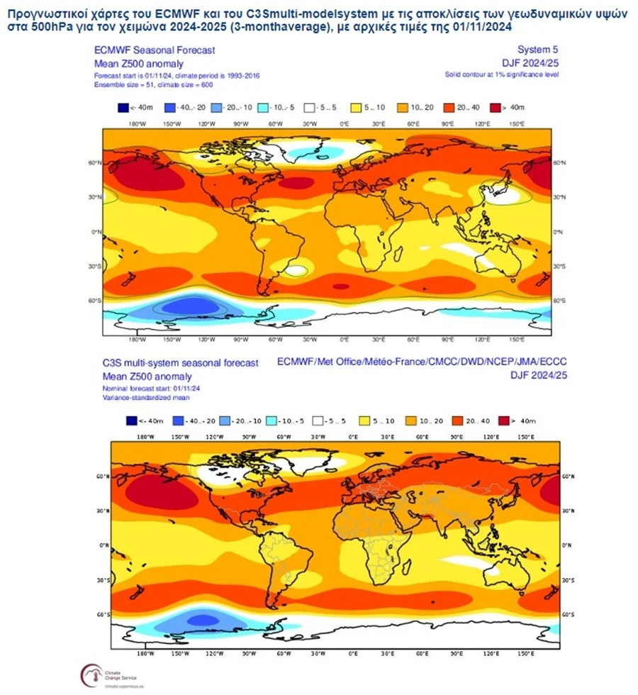 Για τον Χειμώνα 2024-2025 (Δεκέμβριος 2024 – Ιανουάριος – Φεβρουάριος 2025), έχουμε επιλέξει, για παρουσίαση και σχολιασμό, τις αποκλίσεις από τις κανονικές τιμές, της θερμοκρασίας στα 2m, του υετού (βροχή-χιόνι), των γεωδυναμικών υψών στα 500 hPa, καθώς και τις αποκλίσεις της ατμοσφαιρικής πίεσης στην επιφάνεια, έτσι όπως αυτές προκύπτουν, τόσο από το μακροπρόθεσμο μοντέλο του ECMWF, όσο και από το σύστημα πολλαπλών μοντέλων (multi-modelsystem).