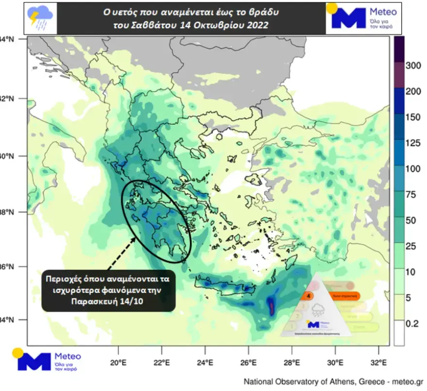 Σύμφωνα με τα τελευταία προγνωστικά δεδομένα του Εθνικού Αστεροσκοπείου Αθηνών / meteo.gr, την Παρασκευή 14/10 η κακοκαιρία ενισχύεται σε σχέση με τις αρχικές εκτιμήσεις και φτάνει την κατηγορία επεισοδίου βροχόπτωσης 4. Για το υπόλοιπο της Παρασκευή 14/10 βροχές αναμένονται στο Ιόνιο, στα ηπειρωτικά, εξαιρουμένης της Ανατολικής Μακεδονίας και της Θράκης και από το μεσημέρι στα νησιά του Αιγαίου και ενδεχομένως στην Κρήτη.
