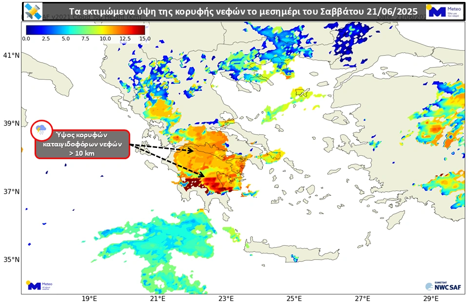 Βροχές και καταιγίδες σημειώθηκαν κυρίως στα κεντρικά και νότια ηπειρωτικά τμήματα το Σάββατο 21/06, με τα φαινόμενα σε Αττική και Πελοπόννησο να είναι ισχυρά. Οι ισχυρές καταιγίδες αποτυπώθηκαν από τον Ευρωπαϊκό Μετεωρολογικό Δορυφόρο Meteosat-10, που μετά από επεξεργασία με εξειδικευμένους αλγορίθμους που πραγματοποίησε το Εθνικό Αστεροσκοπείο Αθηνών / Meteo.gr, υπολογίστηκε ότι τα ύψη των καταιγιδοφόρων νεφών ξεπέρασαν τα 10 km (Εικόνα).