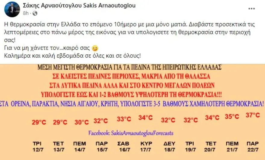 «Η θερμοκρασία στην Ελλάδα το επόμενο 10ήμερο με μια μόνο ματιά. Διαβάστε προσεκτικά τις λεπτομέρειες στο πάνω μέρος της εικόνας για να υπολογίσετε τη θερμοκρασία στην περιοχή σας! Για να μη χάνετε τον… καιρό σας. Καλημέρα και καλή εβδομάδα σε όλες και σε όλους!»