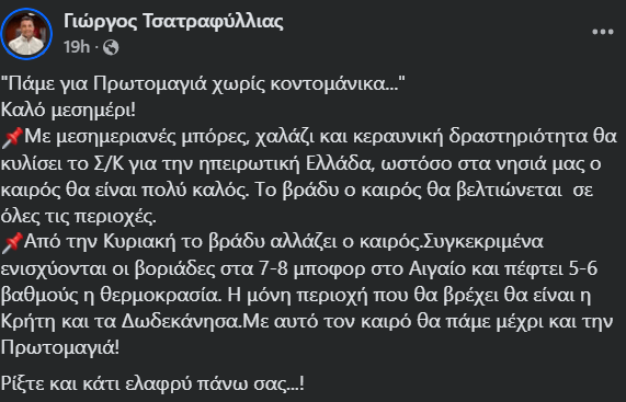 «Από την Κυριακή το βράδυ αλλάζει ο καιρός. Συγκεκριμένα, ενισχύονται οι βοριάδες στα 7-8 μποφόρ στο Αιγαίο και πέφτει 5-6 βαθμούς η θερμοκρασία. Η μόνη περιοχή που θα βρέχει θα είναι η Κρήτη και τα Δωδεκάνησα. Με αυτό τον καιρό θα πάμε μέχρι και την Πρωτομαγιά! Ρίξτε και κάτι ελαφρύ πάνω σας…!».