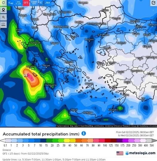 Στον χάρτη βλέπετε τον συνολικό υετο που αναμένεται από την Κυριακή μέχρι την Τετάρτη από το Αμερικάνικο προγνωστικό μοντέλο.
