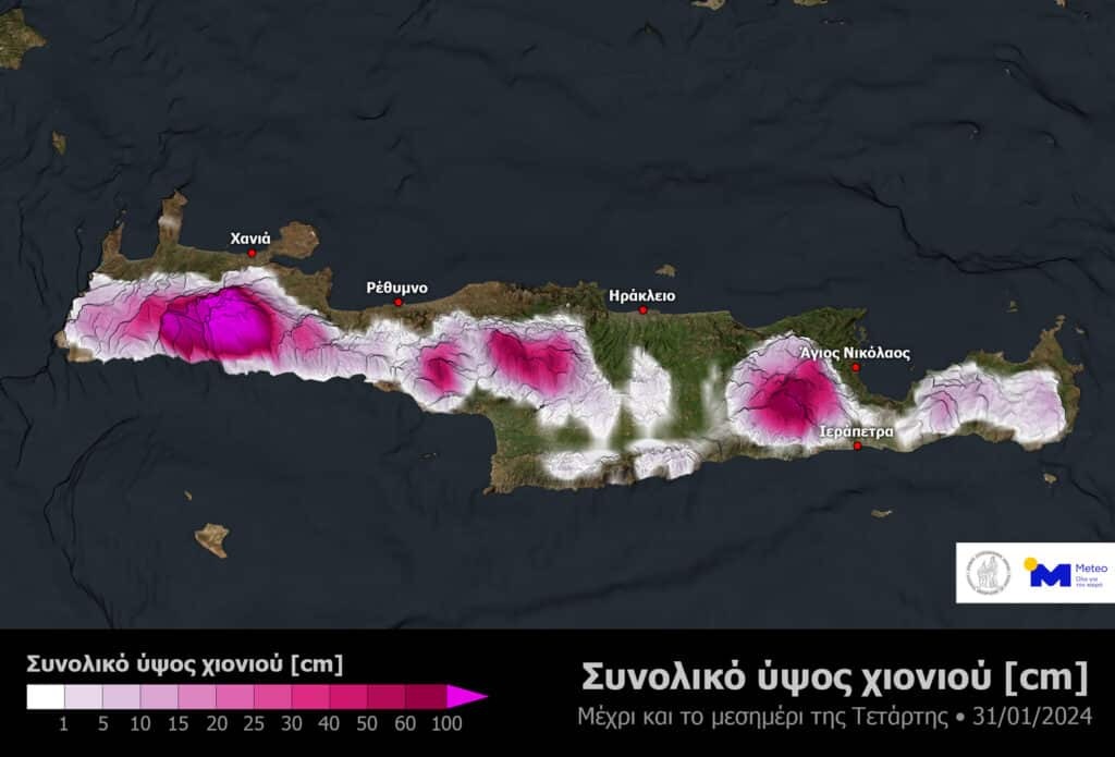 δ) Την Τετάρτη (31-01-24) οι χιονοπτώσεις βαθμιαία θα εξασθενήσουν και θα περιοριστούν στα ορεινά – ημιορεινά της Κρήτης.