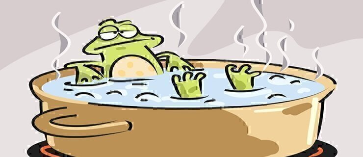 Υ.Γ: Εάν ένας βάτραχος τοποθετηθεί σε μια κατσαρόλα με βραστό νερό, θα πεταχτεί αμέσως έξω. Ωστόσο, αν το βάλουμε σε νερό σε θερμοκρασία περιβάλλοντος και αρχίσουμε να το ζεσταίνουμε σταδιακά, ο βάτραχος θα αρχίσει να προσαρμόζει τη θερμοκρασία του σώματός του στο νέο περιβάλλον αντί να πηδήξει έξω. Ο βάτραχος δεν θα καταλάβει ότι το νερό βράζει, και όταν το κάνει, θα είναι πολύ αργά για να ξεφύγει. Πώς μεταφράζεται αυτή η μεταφορά στην καθημερινότητά μας; Η ουσία του συνδρόμου του βρασμού βατράχου είναι ότι όταν οι συνθήκες διαβίωσής μας επιδεινώνονται σταδιακά, προσαρμοζόμαστε σε αυτές τις συνθήκες αντί να απαλλαγούμε από αυτές, έως ότου δεν είμαστε πλέον αρκετά δυνατοί για να ξεφύγουμε.