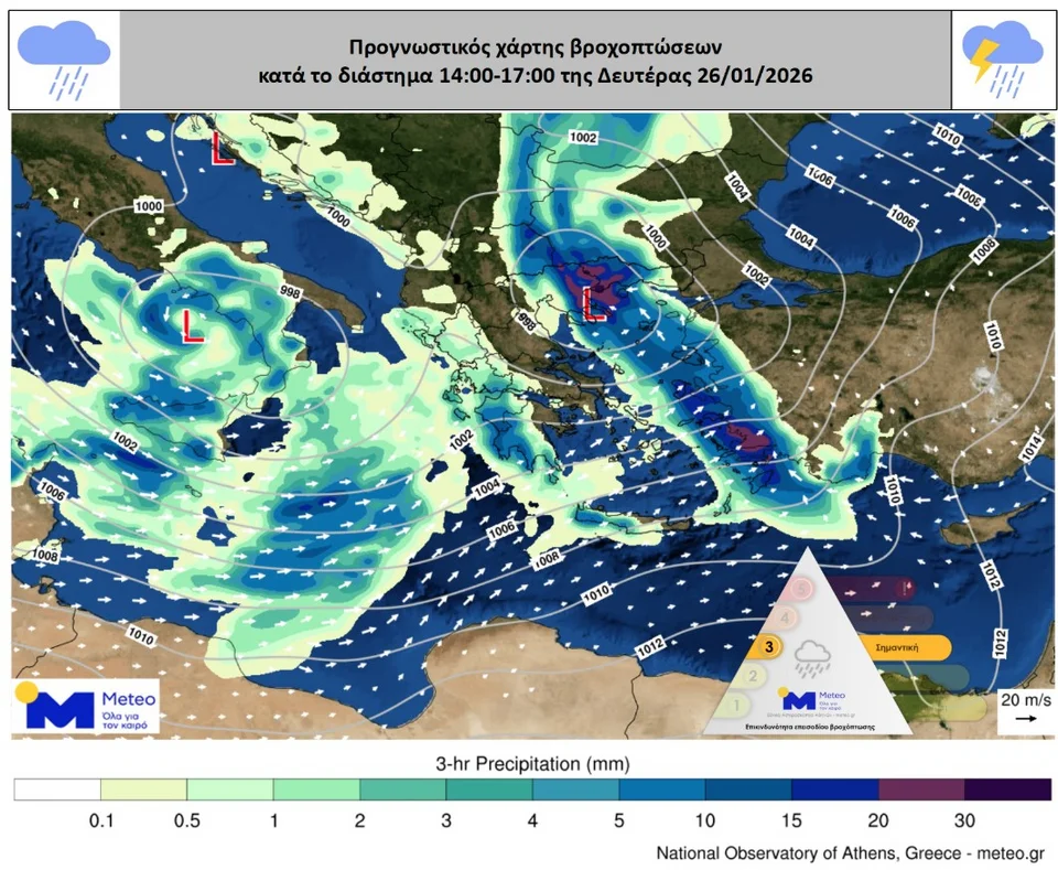 Ισχυρές βροχές και καταιγίδες προβλέπονται τη Δευτέρα (26-01-2026) σε πολλές περιοχές της χώρας μας.