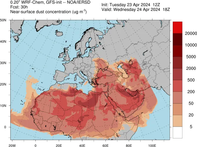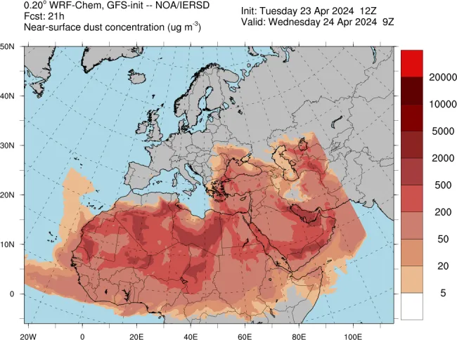Η επικράτηση δυτικών βορειοδυτικών ανέμων θα έχει ως αποτέλεσμα την προοδευτική μεταφορά των υψηλών συγκεντρώσεων σκόνης προς το Αιγαίο, ενώ αύριο οι υψηλές συγκεντρώσεις σκόνης θα εντοπίζονται στα Δωδεκάνησα.