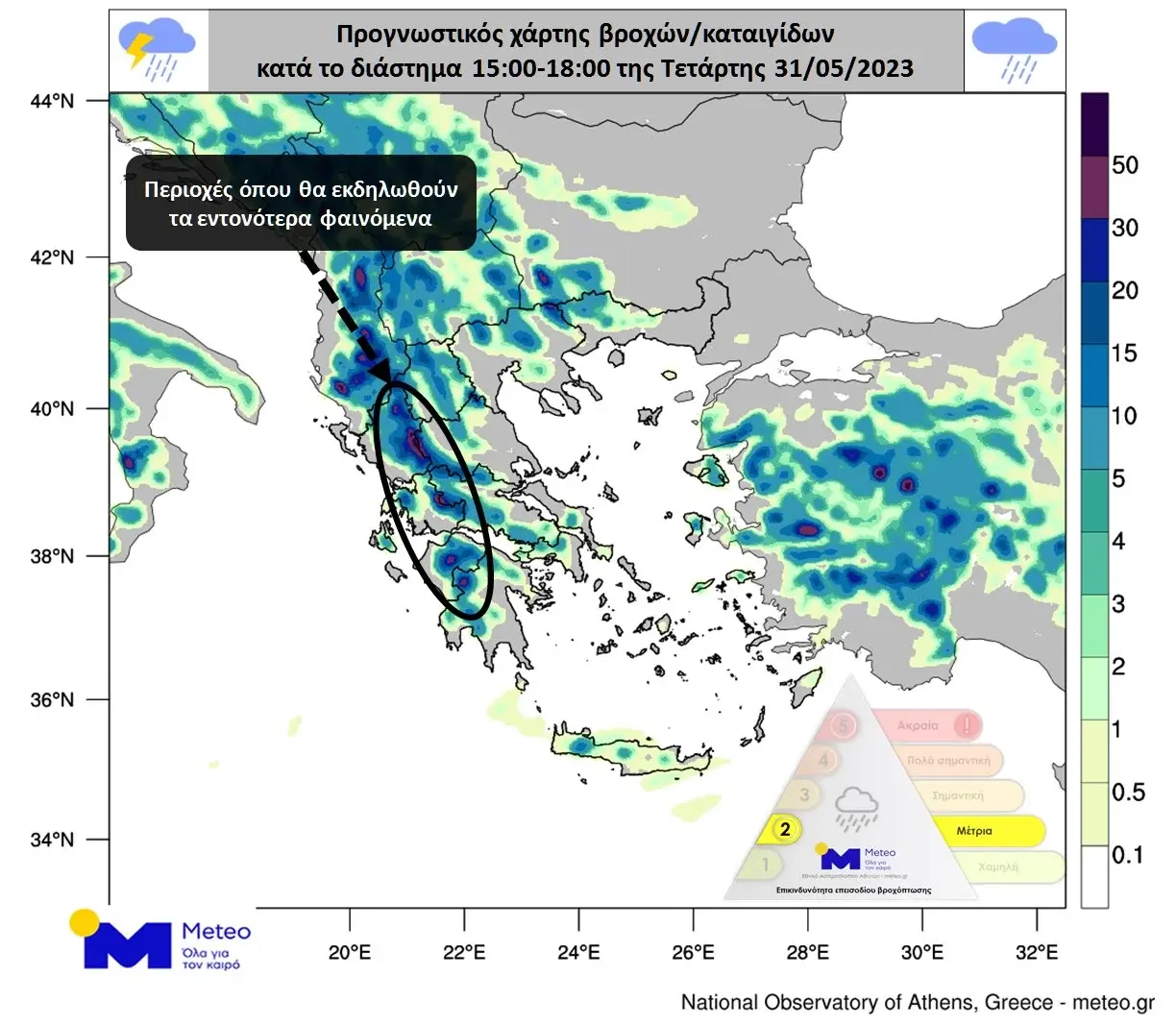 Στον παρακάτω προγνωστικό χάρτη, αποτυπώνεται η γεωγραφική κατανομή των φαινομένων το τρίωρο 15:00 – 18:00 (ώρα Ελλάδας) της Τετάρτης 31/05, διάστημα κατά το οποίο αναμένεται να κορυφωθεί η αστάθεια: