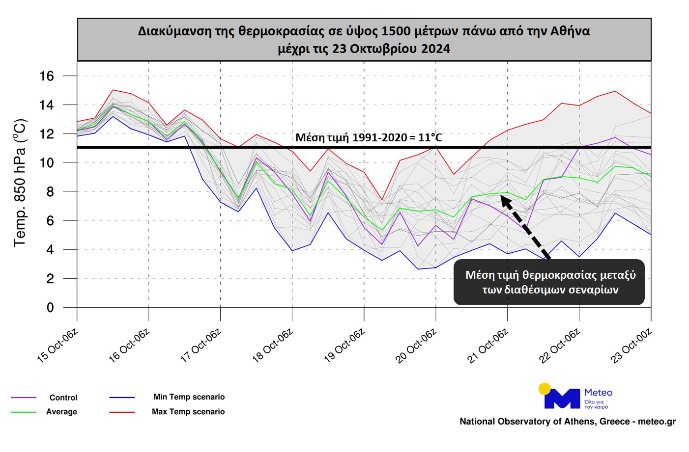 Στην εικόνα που επισυνάπτεται, παρουσιάζεται ενδεικτικά το εύρος διακύμανσης της θερμοκρασίας έως τις 23/10 σε ύψος 1.500 περίπου μέτρων επάνω από την Αθήνα. Με την κόκκινη γραμμή παρουσιάζεται το «θερμότερο» σενάριο ενώ με τη μπλε γραμμή το «ψυχρότερο» σενάριο. Με πράσινη γραμμή παρουσιάζεται η διακύμανση της μέσης θερμοκρασίας με βάση όλα τα διαθέσιμα σενάρια του μοντέλου. Τέλος, με την μαύρη οριζόντια γραμμή σημειώνεται η προσεγγιστική μέση τιμή της εποχής σύμφωνα με δεδομένα της περιόδου 1991-2020. Όπως γίνεται εμφανές, όλα σχεδόν τα σενάρια δίνουν θερμοκρασίες χαμηλότερες συγκριτικά με τις κανονικές για την εποχή.
