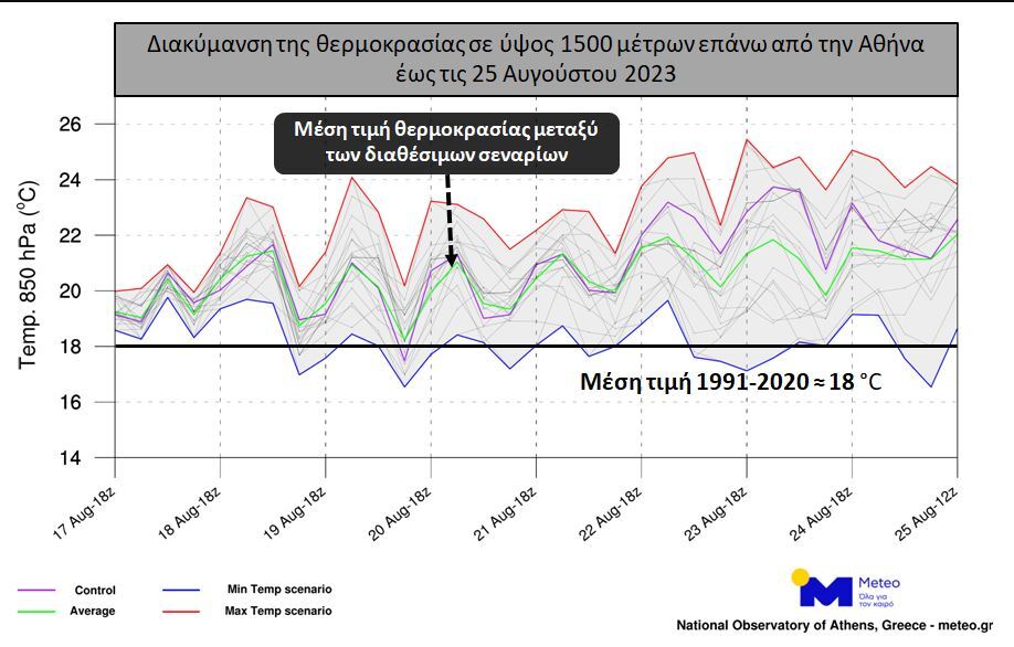 Στην εικόνα που ακολουθεί παρουσιάζεται ενδεικτικά το εύρος διακύμανσης της θερμοκρασίας έως τις 25/08 σε ύψος 1500 περίπου μέτρων επάνω από την Αθήνα. Με την κόκκινη γραμμή παρουσιάζεται το «θερμότερο» σενάριο ενώ με τη μπλε γραμμή το «ψυχρότερο» σενάριο. Με πράσινη γραμμή παρουσιάζεται η διακύμανση της μέσης θερμοκρασίας με βάση όλα τα διαθέσιμα σενάρια του μοντέλου. Τέλος, με τη μαύρη οριζόντια γραμμή σημειώνεται η προσεγγιστική μέση τιμή της περιόδου σύμφωνα με δεδομένα του διαστήματος 1991-2020.