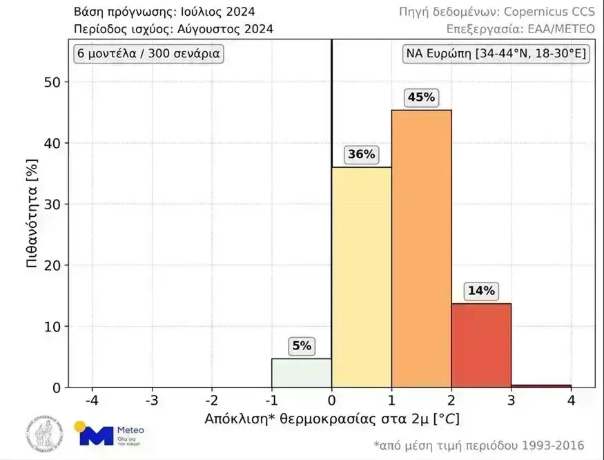 Όπως φαίνεται στο παρακάτω γράφημα, σύμφωνα με το 95 % των διαθέσιμων σεναρίων η μέση θερμοκρασία Αυγούστου θα είναι υψηλότερη από τα κανονικά για την εποχή επίπεδα (περίοδος αναφοράς: 1993-2016). Πιο συγκεκριμένα, τα πιθανότερα σενάρια είναι να σημειωθούν αποκλίσεις της τάξης των 1-2 °C (45 %) και 0-1 °C (36 %). Η πιθανότητα για μέσες θερμοκρασιακές αποκλίσεις άνω των 2 °C είναι 14 %.