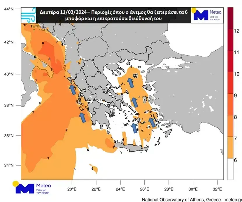 Ισχυροί έως θυελλώδεις άνεμοι (6-8 Μποφόρ) θα επικρατήσουν στο Ιόνιο έως σήμερα το βράδυ και στο Αιγαίο από σήμερα το βράδυ έως αύριο το απόγευμα.