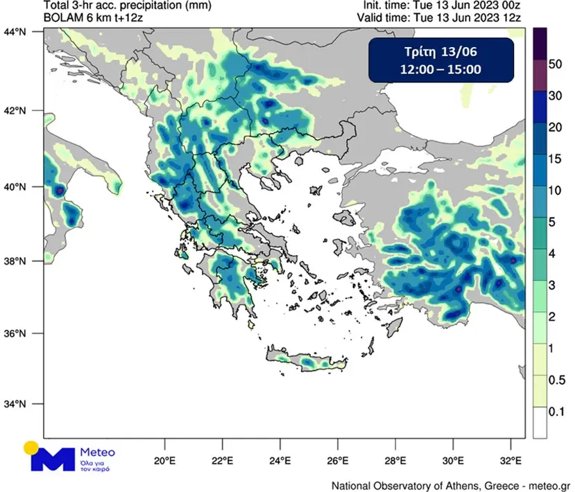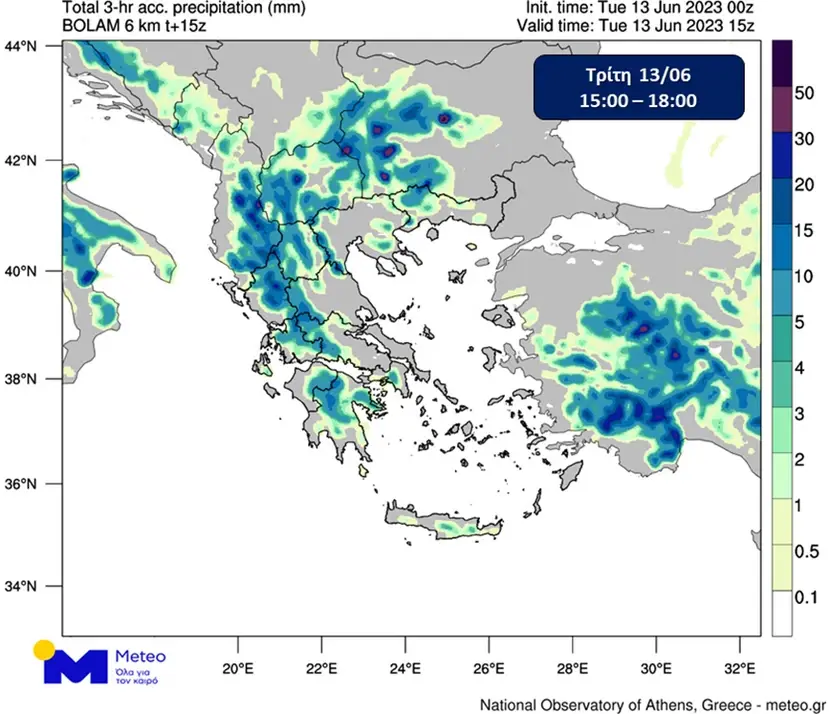 Σύμφωνα με τα διαθέσιμα προγνωστικά στοιχεία του Εθνικού Αστεροσκοπείου Αθηνών / Meteo.gr, την Τρίτη 13/06 αναμένονται αρχικά τοπικές βροχές ή καταιγίδες στα βόρεια ηπειρωτικά, στην Ανατολική Θεσσαλία, στη Βόρεια Εύβοια και στις Σποράδες, ενώ τις μεσημεριανές και απογευματινές ώρες θα εκδηλωθούν καταιγίδες στο μεγαλύτερο τμήμα της ηπειρωτικής χώρας, αλλά και στα ορεινά και ημιορεινά της Κρήτης.