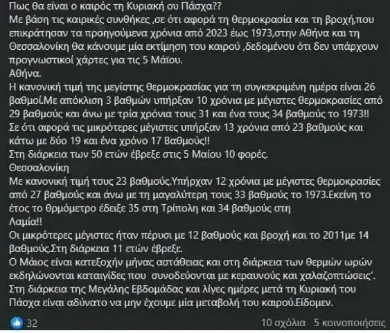 Δεν φαίνεται να έχουμε κάτι ακραίο το Πάσχα, ούτε κρύο ούτε ζέστη.