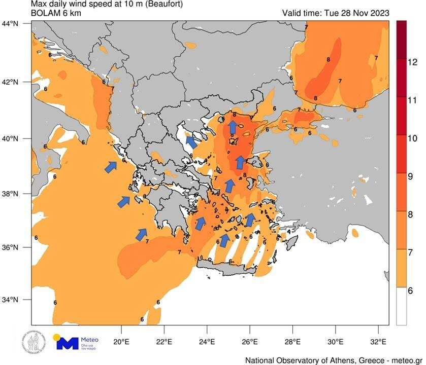 Παράλληλα, την Τρίτη 28/11 αναμένεται σημαντική ενίσχυση των νότιων-νοτιοδυτικών ανέμων με εντάσεις έως 8 μποφόρ στο Αιγαίο. Σταδιακή εξασθένηση των ανέμων αναμένεται από τις πρώτες πρωινές ώρες της Τετάρτης 29/11/2023. Στον παρακάτω Χάρτη 2, παρουσιάζεται η μέγιστη ένταση και η διεύθυνση των ανέμων για την Τρίτη 28/11.