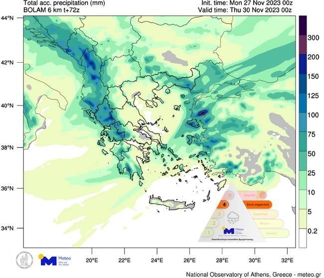 Σύμφωνα με την κατηγοριοποίηση του επεισοδίου βροχόπτωσης (Regional Precipitation Index), η οποία εφαρμόζεται από τη μονάδα Meteo του Εθνικού Αστεροσκοπείου Αθηνών, το επεισόδιο βροχόπτωσης για την Τρίτη 28/11, όπου αναμένονται τα πιο έντονα φαινόμενα, κατατάσσεται στην Κατηγορία 4 (Πολύ Σημαντική).
