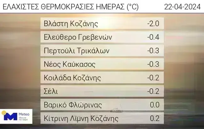 Στον παρακάτω πίνακα παρουσιάζονται οι 8 σταθμοί του δικτύου αυτόματων μετεωρολογικών σταθμών του meteo.gr / Εθνικού Αστεροσκοπείου Αθηνών που κατέγραψαν τις χαμηλότερες θερμοκρασίες το πρωί της Δευτέρας 22/04.