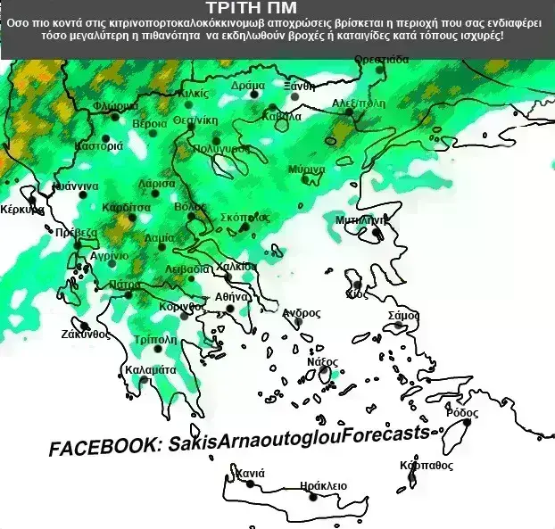 «Οι λασποβροχές βροχές της Τρίτης 23/4 έως και αργά τη νύχτα ανα 6ωρο με μια ματιά! Την Τρίτη αξιόλογες λασποβροχές θα σημειωθούν στα κεντρικά και βόρεια σε συνδυασμό με σχετική ψύχρα στα βόρεια (15-19 βαθμούς), στους 21-25 βαθμούς στα ανατολικά ηπειρωτικά και την Αττική , ενώ έντονο θα είναι το ανοιξιάτικο συννεφόκαμα στα δυτικά και νότια με τη θερμοκρασία στους 28 με 30 και στη βόρεια Κρήτη στους 33 με 35 βαθμούς Κελσίου!», έγραψε στην ανάρτησή του στο Facebook ο Σάκης Αρναούτογλου.