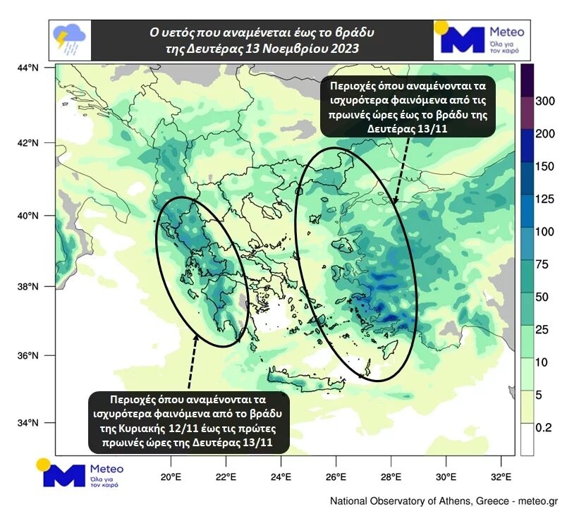 β. Από τις πρώτες πρωινές ώρες της Δευτέρας (13-11-23) μέχρι το μεσημέρι το νότιο Ιόνιο, η δυτική Στερεά, η δυτική και η νότια Πελοπόννησος (πιθανώς τα Κύθηρα, η δυτική Κρήτη και η Θράκη) και βαθμιαία η ανατολική Στερεά (συμπεριλαμβανομένης της Αττικής), η Εύβοια, οι Κυκλάδες (κυρίως οι κεντρικές και νότιες) και το ανατολικό Αιγαίο.