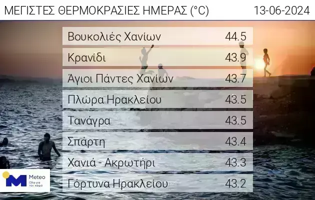 Το meteo.gr έδωσε στη δημοσιότητα τις 8 «κόκκινες» περιοχές, που «ψήθηκαν» στο έλεος του καυτού καιρού, με την υψηλότερη θερμοκρασία να καταγράφεται στα Χανιά και συγκεκριμένα στις Βουκολιές, όπου ο υδράργυρος «σκαρφάλωσε» στους 44,5 βαθμούς Κελσίου, καταγράφοντας ρεκόρ Ιουνίου από το 1980!