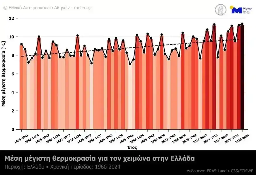 Ο χειμώνας του 2023-2024 καταγράφεται ως ο θερμότερος στα χρονικά για την Ελλάδα, ξεπερνώντας τον χειμώνα του 2015-2016. Πολύ σημαντικό γεγονός είναι πως τα τελευταία 10 χρόνια έχουν καταγραφεί οι 6 θερμότεροι χειμώνες όλων των εποχών. Η μέση μέγιστη θερμοκρασία στην Ελλάδα από το 1960 μέχρι και το 2024 για την περίοδο του χειμώνα παρουσιάζει άνοδο κατά 1.8 °C.