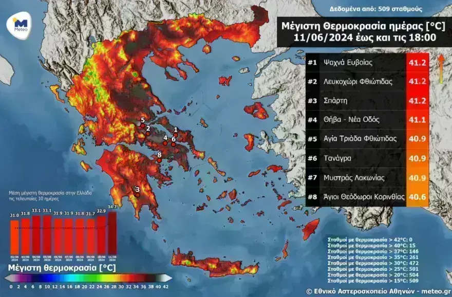 «Σε κλοιό καύσωνα αρκετές περιοχές της χώρας μας τις επόμενες ημέρες με τον υδράργυρο να προσεγγίζει και τους 43° βαθμούς κελσίου σε εσωτερικές περιοχές της ηπειρωτικής χώρας.