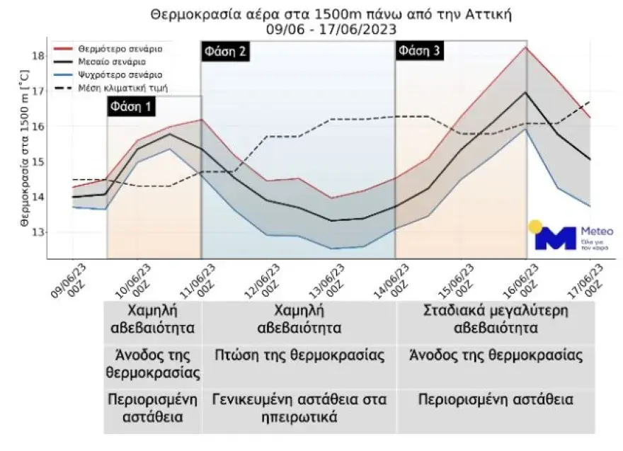 Φάση τρίτη, διάστημα Τετάρτη 14/06-Πέμπτη 15/06: Περιορισμός της αστάθειας στα ορεινά. Άνοδος της θερμοκρασίας σε κοντά στα φυσιολογικά για την εποχή επίπεδα (τοπικά στην Κρήτη σε έως και πάνω από τα φυσιολογικά για την εποχή επίπεδα). Τέλος, αξίζει να σημειωθεί ότι παρόλη την προγνωστική αβεβαιότητα, η ατμοσφαιρική αστάθεια φαίνεται να γενικεύεται εκ νέου κυρίως στα κεντρικά και βόρεια ηπειρωτικά από την Παρασκευή 16/06 και έως το τέλος του δεύτερου δεκαημέρου του Ιουνίου.
