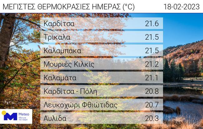 Οι υψηλότερες μέγιστες θερμοκρασίες καταγράφηκαν σε Καρδίτσα (21,6 βαθμοί), Τρίκαλα (21,5), Καλαμπάκα (21,5), Μουριές Κιλκίς (21,2) και Καλαμάτα (21,1).