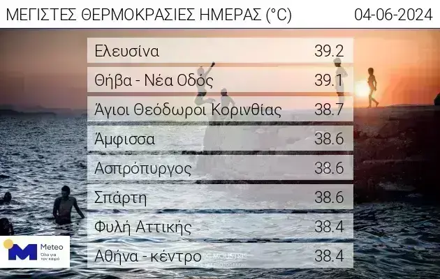 Σε πίνακα του Meteo παρουσιάζονται οι μέγιστες θερμοκρασίες της σημερινής ημέρας και όπως φαίνεται, στην Ελευσίνα το θερμόμετρο έδειξε 39,2 βαθμούς Κελσίου, την ίδια στιγμή που στη Θήβα (στην εθνική οδό) έφτασε τους 39,1 βαθμούς. Στους Αγίους Θεοδώρους το θερμόμετρο έδειξε 38,7 βαθμούς, ενώ σε Ασπρόπυργο, Άμφισσα και Σπάρτη τους 38,6 βαθμούς Κελσίου. Στο κέντρο της Αθήνας, δε, η θερμοκρασία έφτασε τους 38,4 βαθμούς Κελσίου.