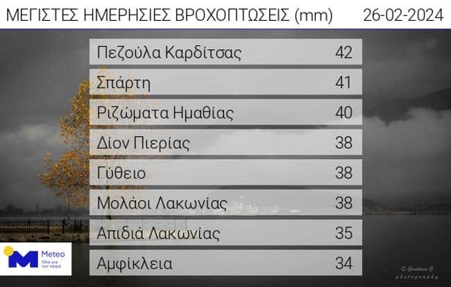 Από τα μεσάνυχτα της Κυριακής 25/2 έως τις 8 π.μ. της Δευτέρας 26/2, τα μεγαλύτερα ύψη βροχής σημειώθηκαν στην Πεζούλα Καρδίτσας (42 χιλιοστά), στην Σπάρτη (41), στα Ριζώματα Ημαθίας (40), στο Δίον Πιερίας (38), στο Γύθειο (38) και στους Μολάους Λακωνίας (38).