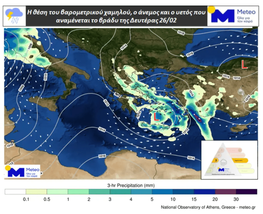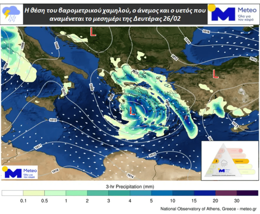 Στους χάρτες των Εικόνων 2 και 3 παρουσιάζεται η θέση του βαρομετρικού χαμηλού, ο άνεμος και ο υετός που αναμένεται το μεσημέρι και το βράδυ της Δευτέρας 26/02.