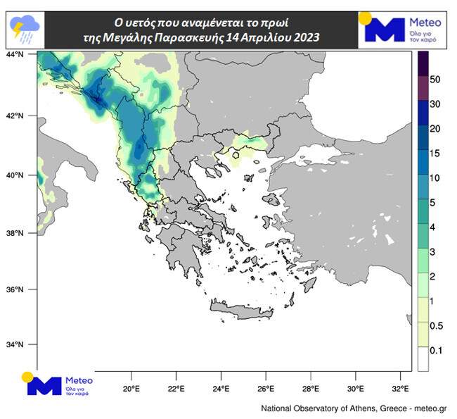 Στον Χάρτη 1 παρουσιάζεται ενδεικτικά ο υετός που αναμένεται το πρωί της Μεγάλης Παρασκευής 14/03.