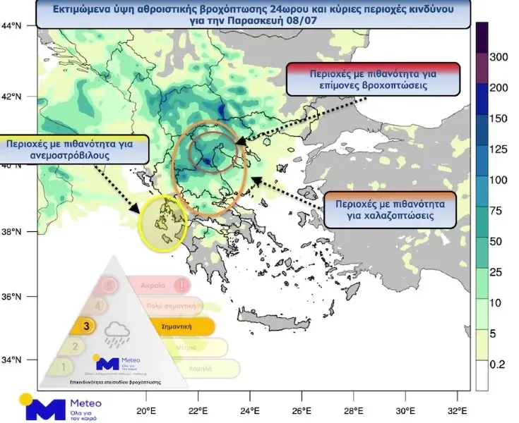 Τα κύρια χαρακτηριστικά αυτής της κακοκαιρίας κατα τη διάρκεια της Παρασκευής 8/7 είναι: