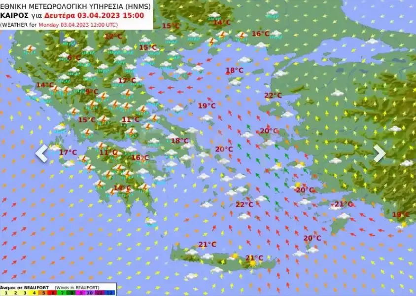 Οι άνεμοι σήμερα, Δευτέρα (03.04.2023) θα πνέουν από νότιες διευθύνσεις 4 με 6 και τοπικά στο Αιγαίο 7 με 8 μποφόρ. Η θερμοκρασία θα σημειώσει μικρή πτώση κυρίως στα δυτικά και τα βόρεια όπου θα φθάσει τους 17 με 18 βαθμούς, στις υπόλοιπες περιοχές τους 18 με 20 και τοπικά στην Κρήτη και τα νησιά του νοτιοανατολικού Αιγαίου τους 21 βαθμούς Κελσίου.