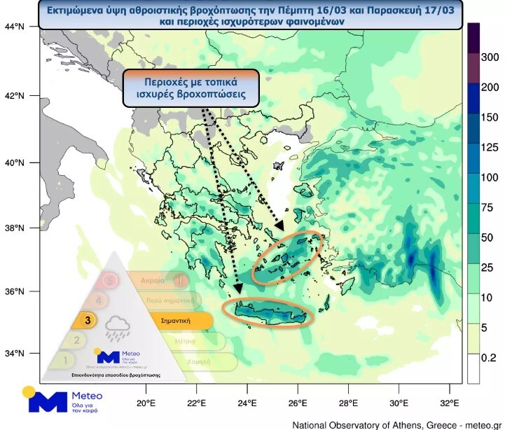 Το παρακάτω γράφημα δείχνει το εκτιμώμενο ύψος αθροιστικής βροχόπτωσης και τις περιοχές ισχυρότερων φαινομένων κατά τη διάρκεια της Πέμπτης 16/03 και της Παρασκευής 17/03.