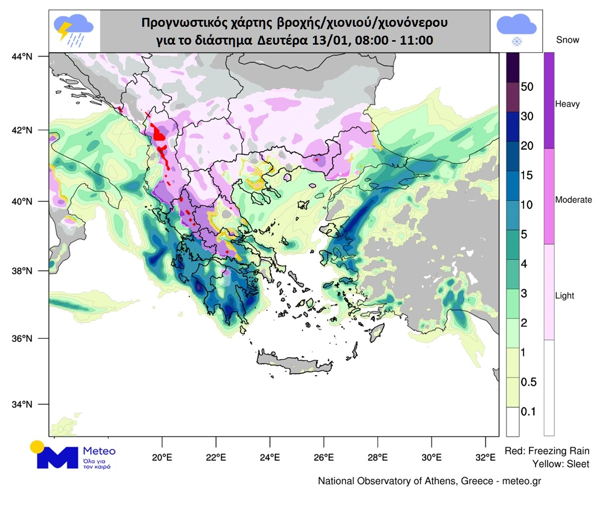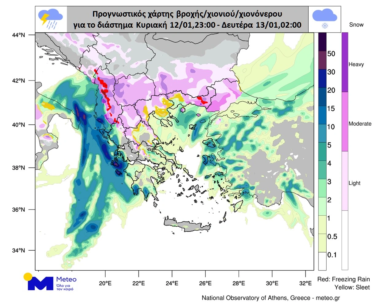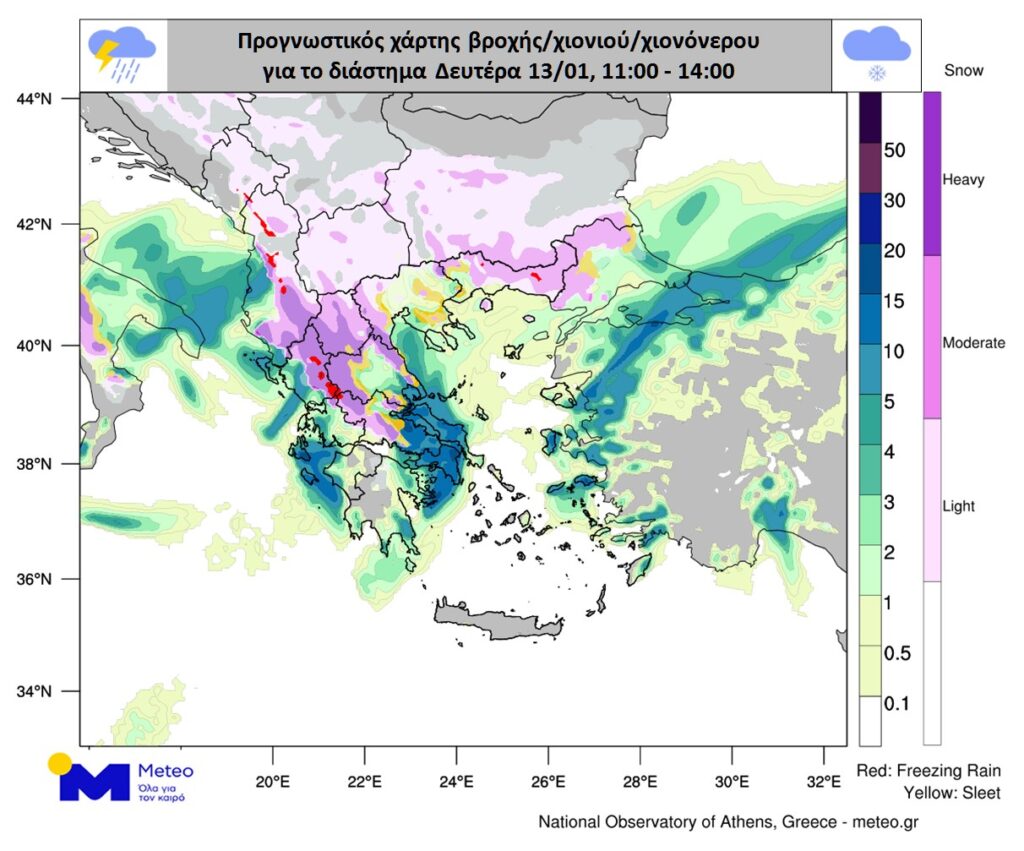 Η πρόγνωση για βροχές και χιόνια το πρωί της Δευτέρας.